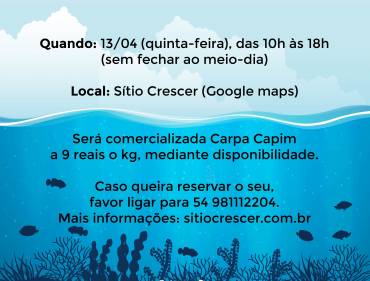 1ª Feira do Peixe Vivo do Sítio Quando: 13/04, das 10h às 18h (sem fechar ao meio dia) Local: Sítio ...